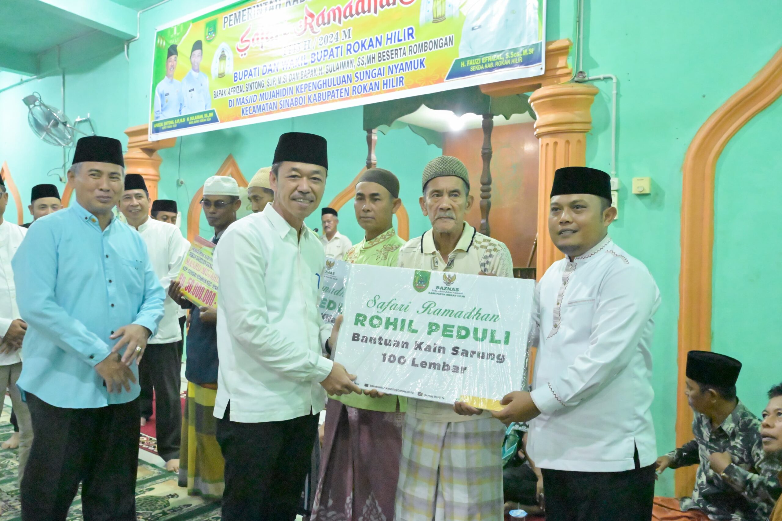 Safari Ramadhan kedua Bupati Rohil menyerahkan bantuan dana operasional Masjid Mujahidin sejumlah Rp.50 juta, bantuan penyelenggara Fardu Kifayah kepada 20 penerima manfaat senilai 10 juta rupiah dengan masing-masing menerima sejumlah Rp.500 ribu, penyerahan 100 lembar kain sarung dari Baznas Rohil yang diterima secara simbolis serta penyerahan jam digital untuk Masjid dan Musholla Se Rohil.