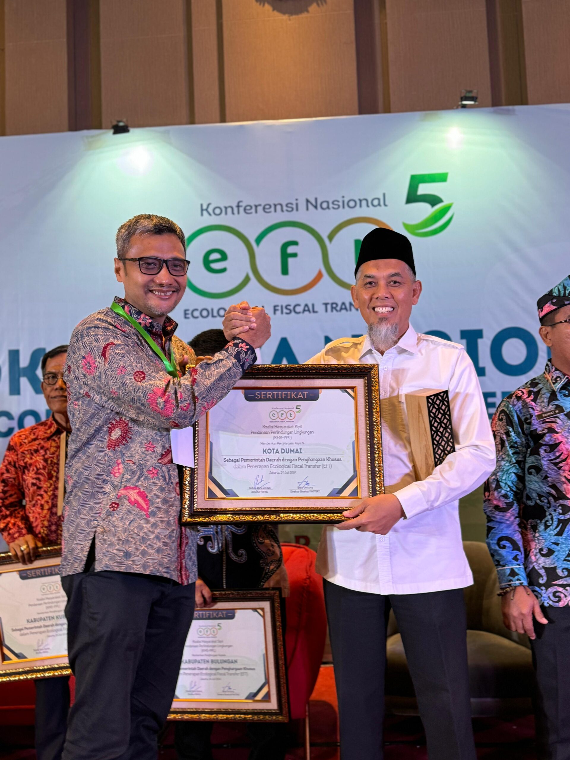 Wali Kota Dumai, H Paisal, meraih penghargaan bergengsi dari Koalisi Masyarakat Sipil untuk Pendanaan Perlindungan Lingkungan (KMS-PPL) dalam acara Lokakarya Ecological Fiscal Transfer (EFT) yang digelar di Luminor Hotel, Jakarta.
