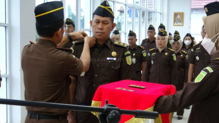 Kepala Kejaksaan Negeri Dumai, Dr Agustinus Herimulyanto, S.H, M.H saat memimpin prosesi kenaikan pangkat Kasi Intel Kejari Dumai Abu Nawas, S.H, M.H, Senin (03/04/2023).
