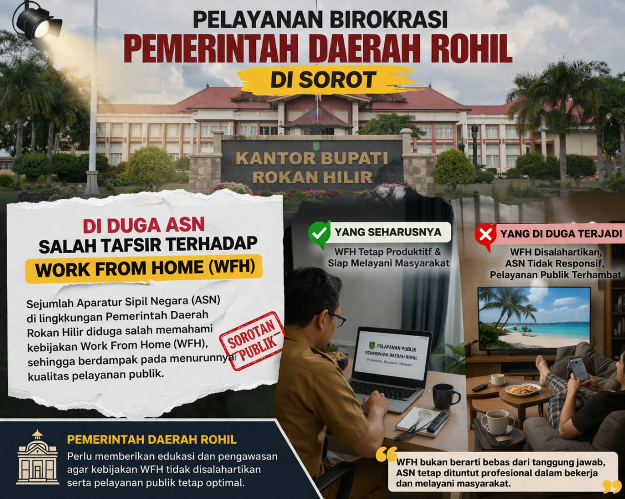 kabarViral, Rokan Hilir – Pelaksanaan kebijakan work from home (WFH) di lingkungan Pemerintah Kabupaten Rokan Hilir menuai sorotan publik. Kebijakan yang mengacu pada Surat Edaran Menteri Dalam Negeri Nomor 800.1.5/3349/SJ tersebut dinilai tidak berjalan sebagaimana mestinya, bahkan diduga disalahartikan oleh sejumlah Aparatur Sipil Negara (ASN).