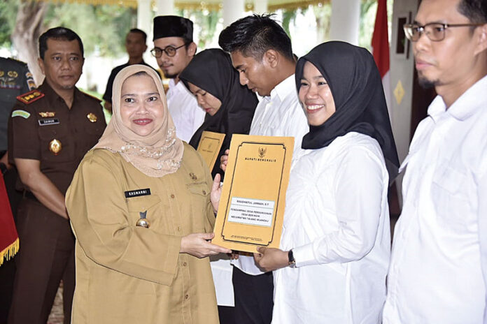 Bupati Bengkalis Kasmarni menyerahkan SK pengangkatan kepada 341 pendamping desa/kelurahan di Bengkalis, Senin (8/1/2024)