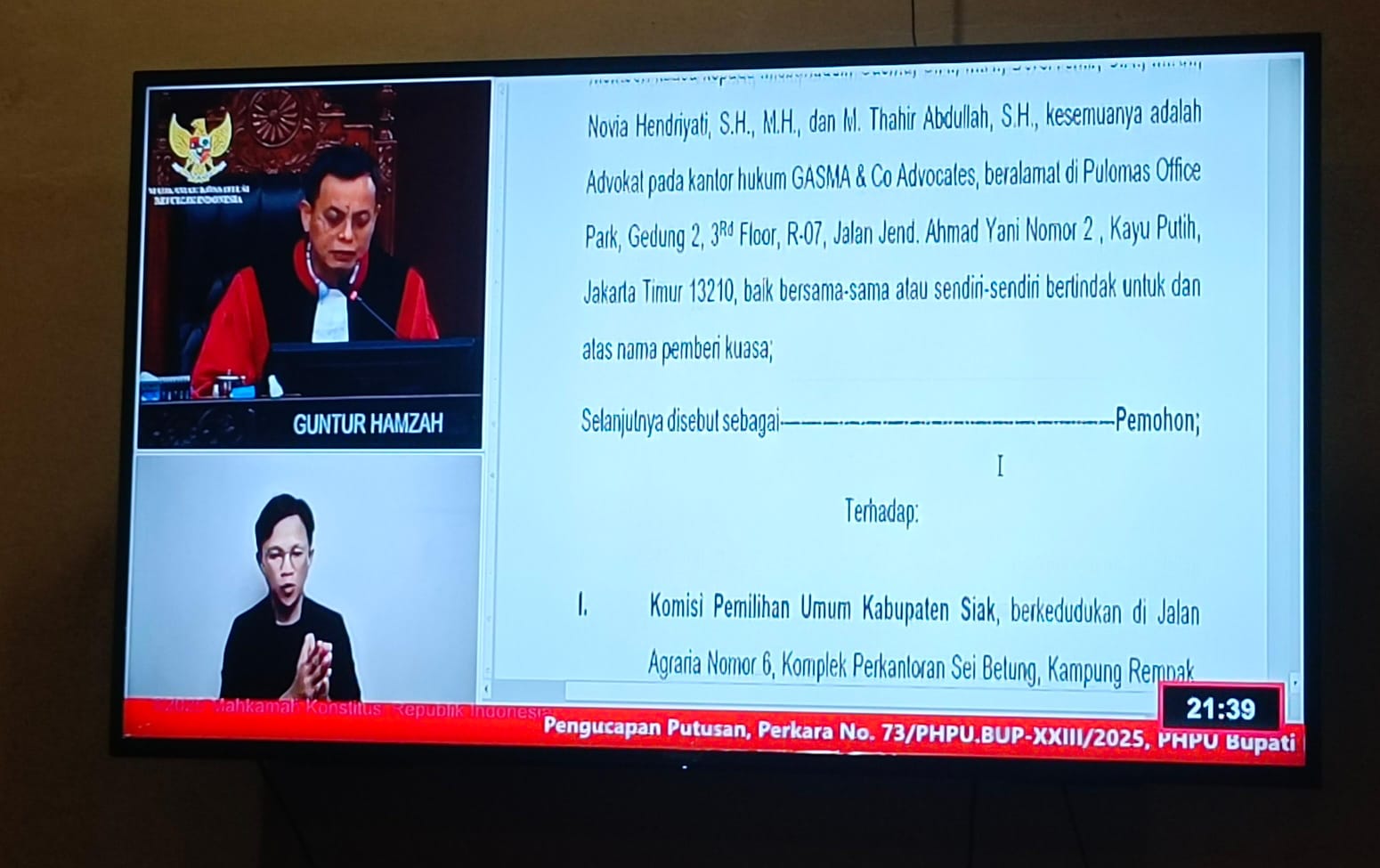 Sidang putusan PHPU Pilkada Kabupaten Siak dipimpin oleh Hakim Guntur Hamzah. Perkara dengan nomor 73/PHPU.BUP-XXIII/2025 ini dimulai pukul 21.40 WIB. Dalam putusannya, MK menolak eksepsi dari pihak termohon dan pihak terkait secara keseluruhan serta mengabulkan sebagian permohonan dari pemohon.