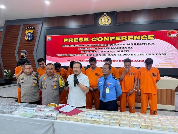 Kabarviral, Pekanbaru – Kepolisian Daerah (Polda) Riau berhasil mengungkap jaringan peredaran narkoba internasional. Sebanyak delapan orang tersangka diamankan dengan barang bukti yang mencengangkan, yakni 76 kilogram sabu dan 41 ribu butir pil ekstasi, dengan nilai mencapai Rp88,3 miliar.