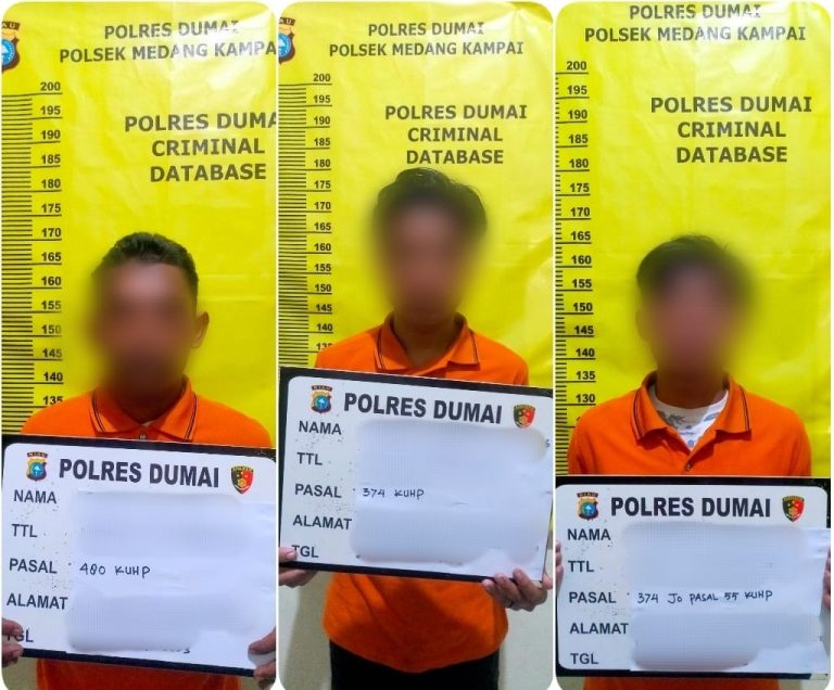 Dijelaskan Kapolres Dumai AKBP Dhovan Oktavianton, S.H, S.I.K, M.Si melalui Kapolsek Medang Kampai AKP Edwi Sunardi, S.AP, S.H, pelaku Tindak Pidana Penggelapan di PT. Wicaksana Mas yang berhasil diamankan yakni GA Alias GL (21) warga Kabupaten Serdang Bedagai Provinsi Sumatera Utara selaku Mandor PT. Wicaksana Mas, AY Alias YR (21) warga Kabupaten Batu Bara Provinsi Sumatera Utara selaku Teknisi Perancah PT. Wicaksana Mas dan SS Alias SN (41) warga Kecamatan Medang Kampai selaku Penadah Barang Hasil Penggelapan.