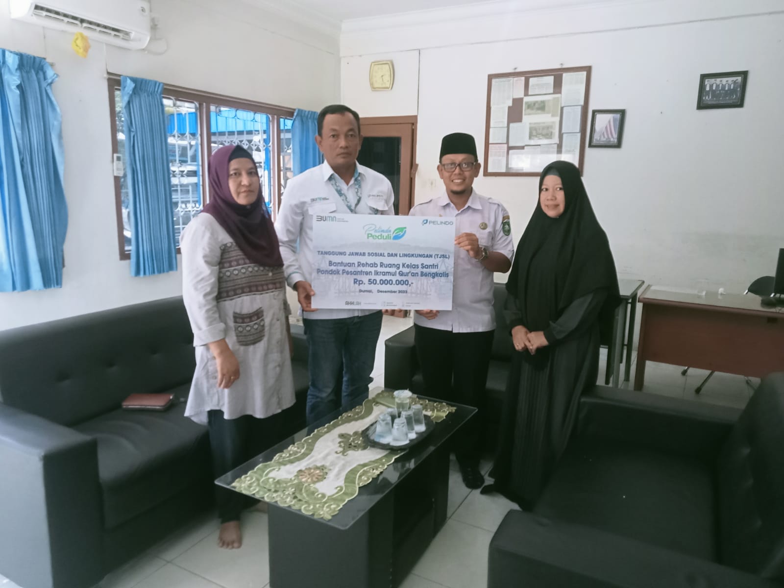 Menejer Kawasan Bengkalis Deddy Ismoyo secara simbolis menyerahkan bantuan TJSL untuk rehab ruang kelas santri Pondok Pesantren Ikramul Qur’an Bengkalis