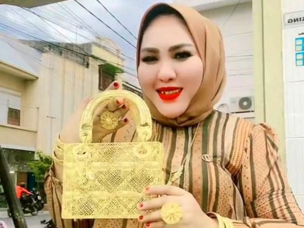 Ditambah sebuah tas kecil yang juga diduga terbuat dari emas plus cincin di kedua tangan, gelang, plus bando emas yang dijadikan penjepit kerudung hitam yang dikenakan.