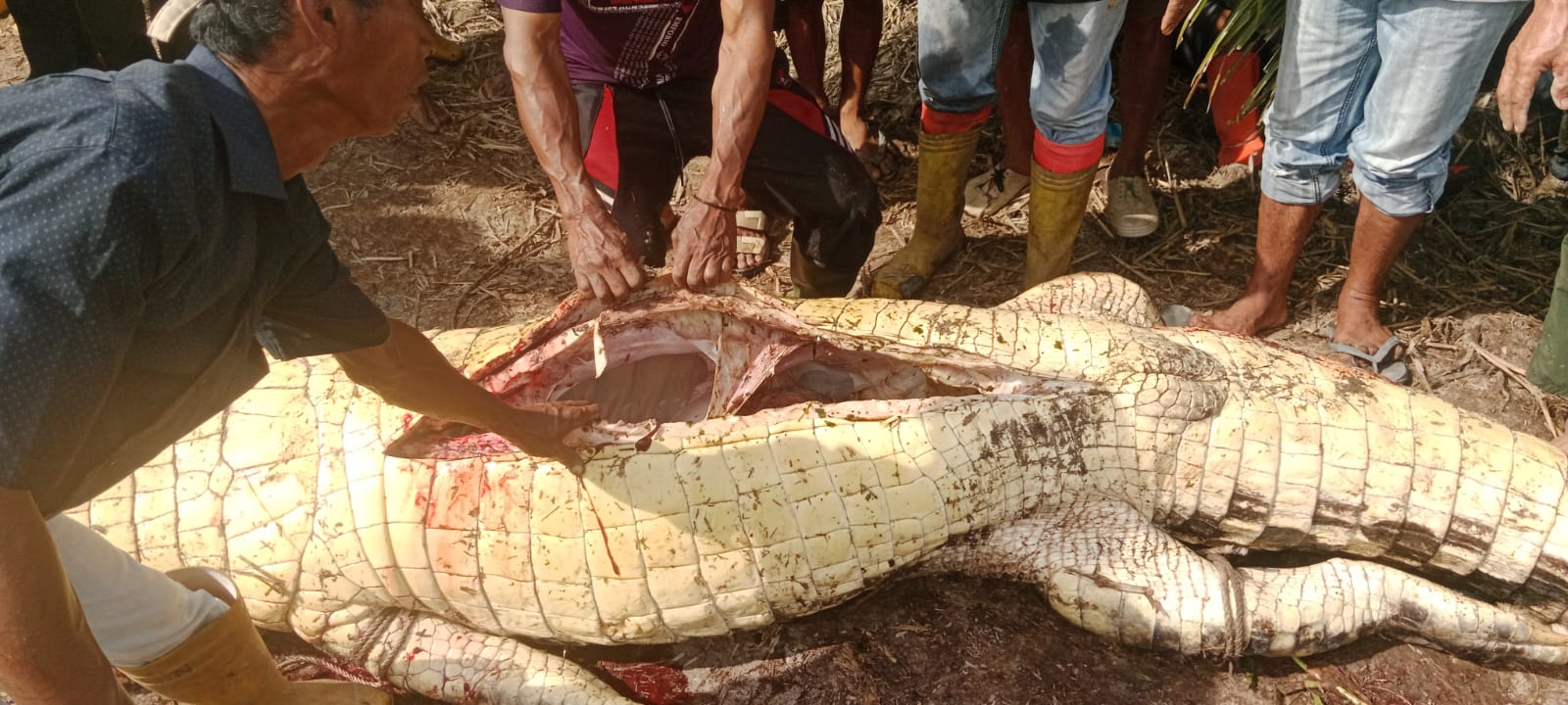 Dengan cepat, warga berupaya menangkap buaya tersebut menggunakan dua mesin genset untuk menyetrum air. Setelah berhasil melumpuhkan buaya, warga langsung membawa hewan tersebut ke darat. Yang lebih mengerikan, ketika buaya itu dibelah, kepala korban ditemukan di dalam perutnya.